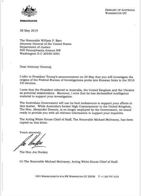 Der australische Botschafter bestätigte bereits im Mai, dass Präsident Trump angekündigt hatte, dass Bill Barr eine Untersuchung über die Ursprünge von Spygate durchführen und Barr Hilfe anbieten werde. Mr. Hockey sagte: "Die australische Regierung wird ihr Bestes tun, um Ihre Bemühungen in dieser Angelegenheit zu unterstützen. Während der ehemalige australische Hochkommissar für das Vereinigte Königreich, The Hon. Alexander Downer, nicht mehr bei der Regierung beschäftigt ist, sind wir bereit, Ihnen alle relevanten Informationen zur Verfügung zu stellen, um Ihre Anfragen zu unterstützen....".
