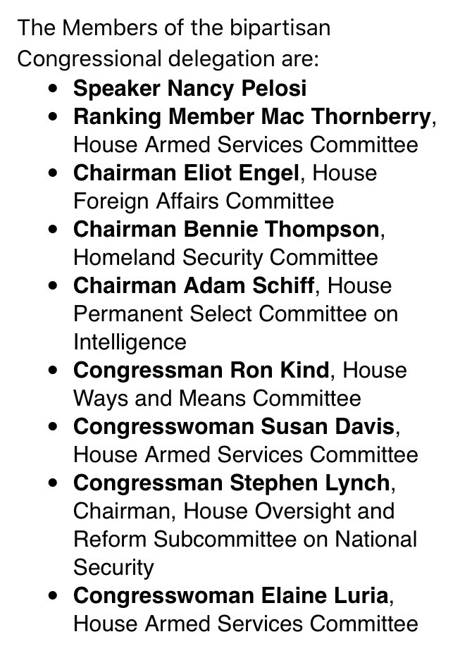 "Sprecherin Pelosi ist in Jordanien und führt CODEL mit dem Intel-Vorsitzenden Schiff, dem Vorsitzenden für auswärtige Angelegenheiten Engel, dem Vorsitzenden für Heimatschutz Thompson, dem republikanischen Spitzen-Thornberry und anderen demokratischen Mitgliedern bei einem Treffen mit König Abdullah II und führenden US-Regierungsbeamten."